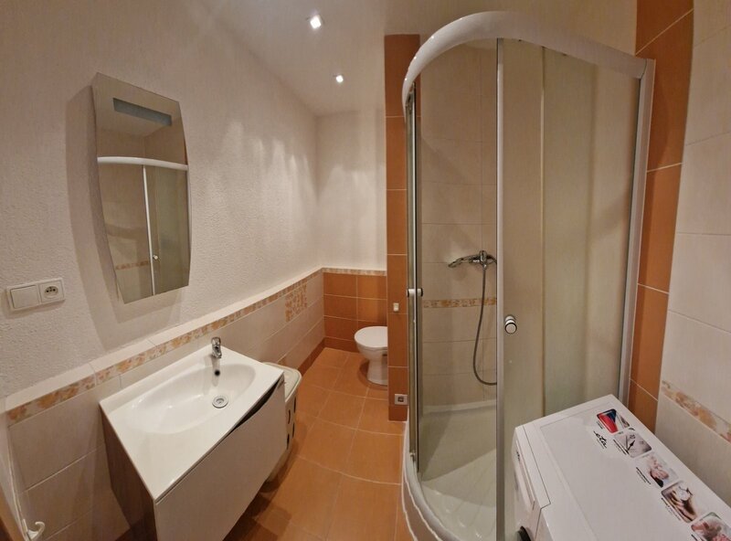Koupelna je vybavena sprchovým koutem a pračkou. Ohřev vody a vytápění je